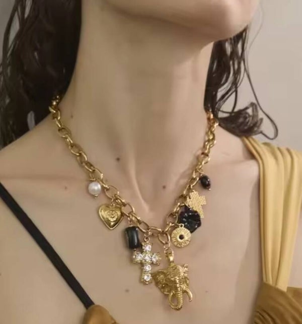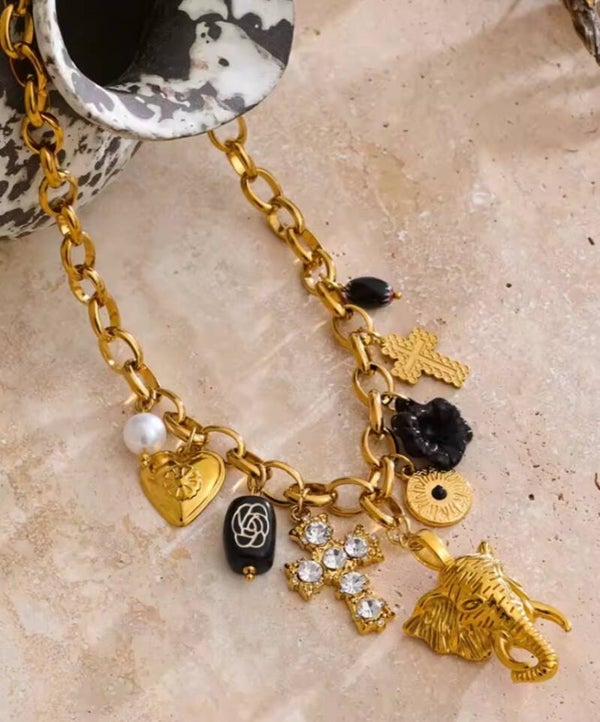 Collana multi charm in acciaio inossidabile, ciondoli in resina, perle sintetiche e acciaio.