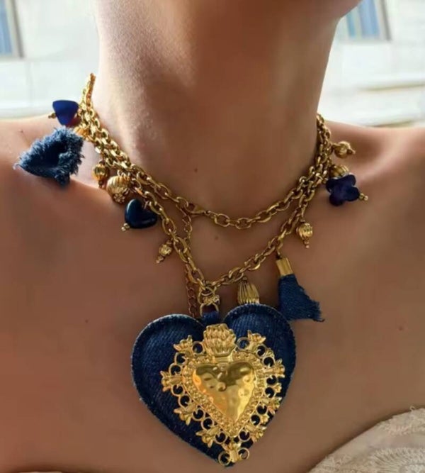 Collana lunga in acciaio inossidabile Gold impreziosita da nappine in denim e un grande cuore sovrapposto denim e cuore sacro in acciaio inossidabile