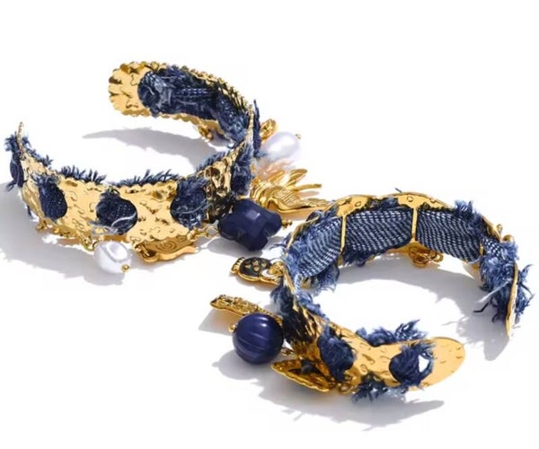 Bracciale rigido in acciaio inossidabile e deni impreziosito da charms in acciaio inossidabile e resina.