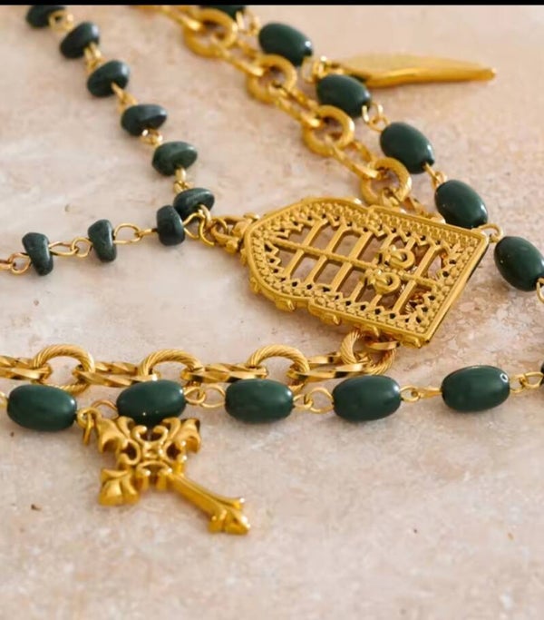 Collana multi filo, 3 strati in acciaio inossidabile Gold e perle sintetiche color verde bosco impreziosita da charms.